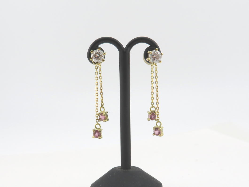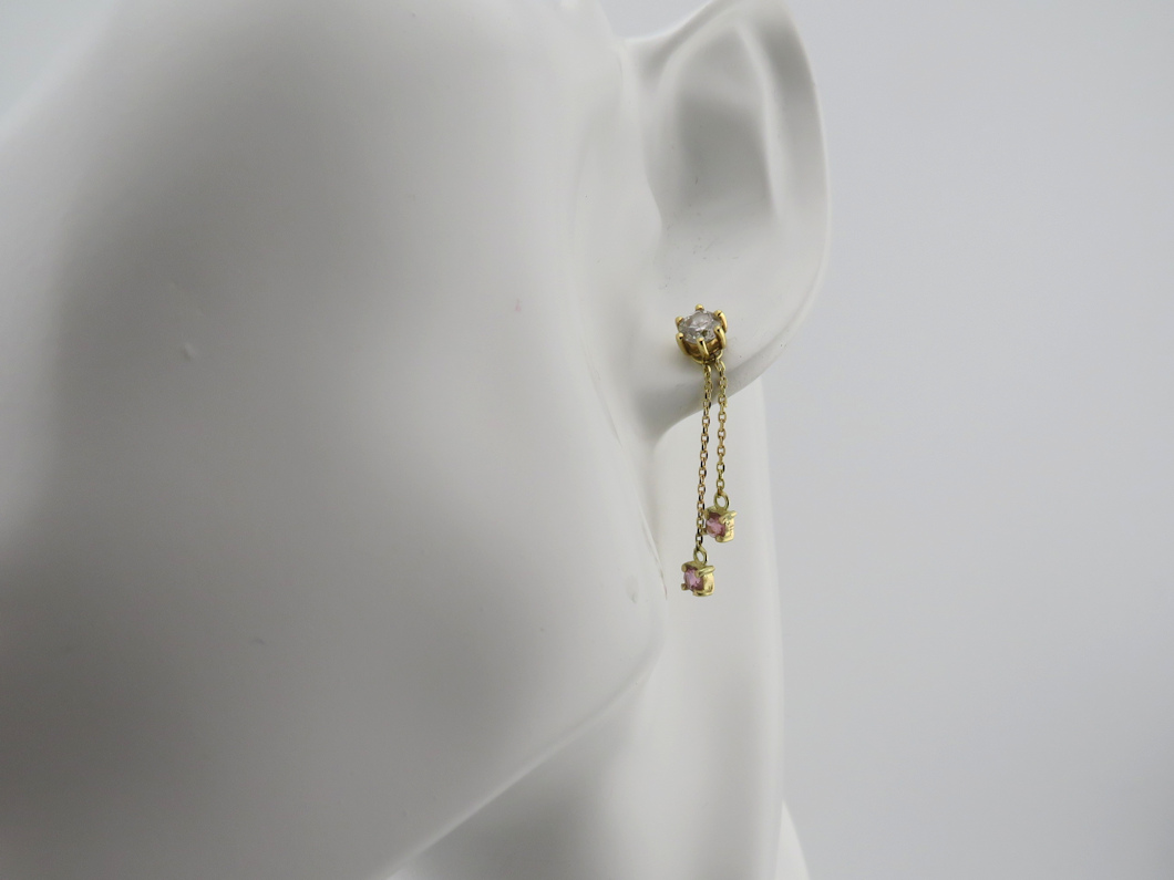 リングにはたくさんのピンクトルマリンが留まっていました。リングから石をお外しして、2連の揺れるピアスチャームをお作りしました。